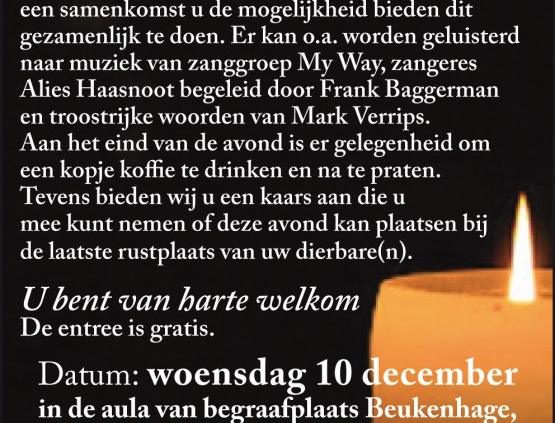 Het is niet van belang of u wel of geen kerkelijke achtergrond heeft, of dat uw dierbare al langer geleden is overleden, iedereen is welkom. Het doel van deze bijeenkomst is om samen het verdriet te delen en troost te vinden. Aan het eind van de avond is er gelegenheid om een kopje koffie te drinken en na te praten. Tevens wordt u een kaars aangeboden die u mee naar huis kunt nemen of die avond kan plaatsen bij de laatste rustplaats van uw dierbare(n). U kunt gratis deze samenkomst bezoeken, wel graag vooraf aanmelden bij de uitvaartverzorging via telefoon 0174‐412230 of e-mail: gmeer@caiway.nl