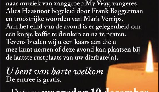 Zanggroep My Way zal een aantal muziekstukken zingen en er zullen troostrijke woorden gesproken worden door Mark Verrips. Verder zingt Alies Haasnoot, begeleid door Frank Baggerman, een aantal mooie nummers.